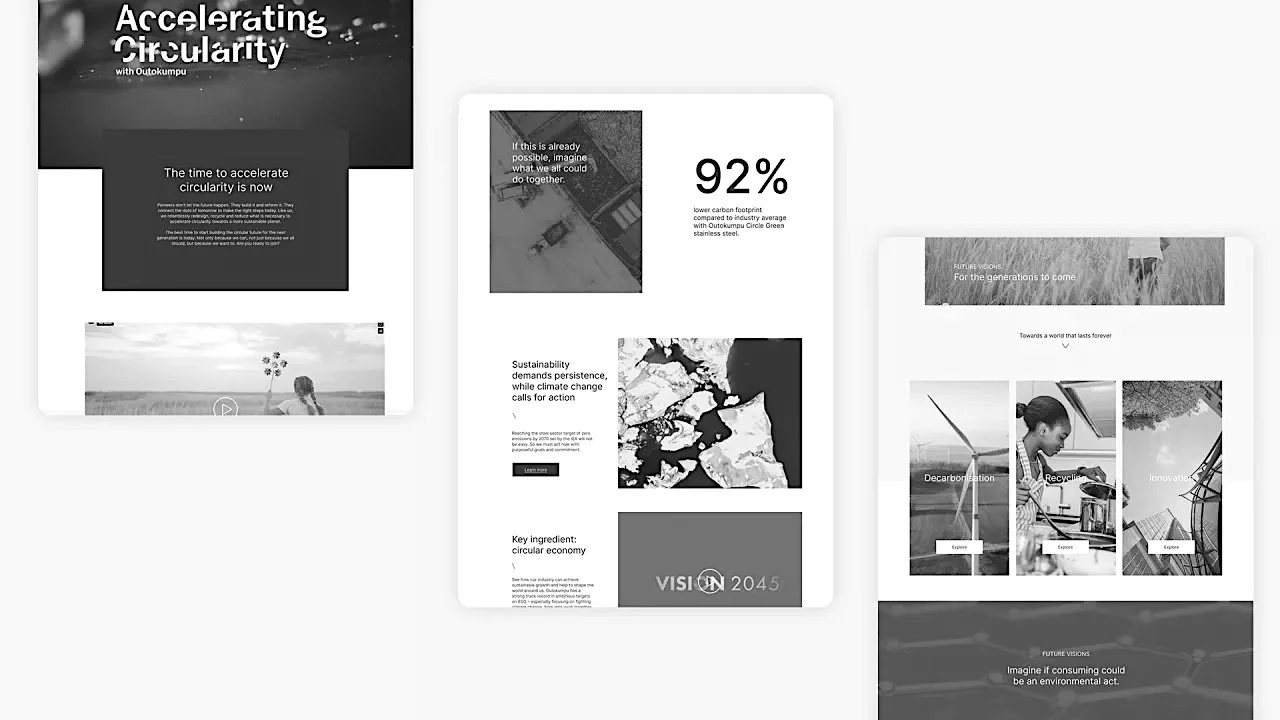 Outokumpu - kiertotalouden kovinta kärkeä. Harva tietää, että Euroopan suurin kierrätyskeskus sijaitsee Torniossa. Tai ehkä sen tietävät kaikki paitsi minä. Vaikuttavaa se on joka tapauksessa. Kuten on sekin, että Outokummun ruostumaton teräs on maailman vastuullisinta. Se on kotoisin tuolta Torniosta. On iso yhteinen henkselin paukuttelun aihe, että Suomesta tulee ruostumatonta terästä, joka on valmistettu 90 % kierrätetystä materiaalista ja alan keskiarvoa 70 % pienemmällä hiilijalanjäljellä. Voisihan tuosta, ja vaikkapa siitä, että Outokumpu on ainoana teräsyhtiönä sitoutunut rajoittamaan ilmaston lämpenemisen alle 1,5 ºC, kertoa vähän enemmänkin. Ja niin me teimme, digikanaviin painottuen ja pohjautuen rakentamaamme “Accelerating Circularity” sisältösivustoon.