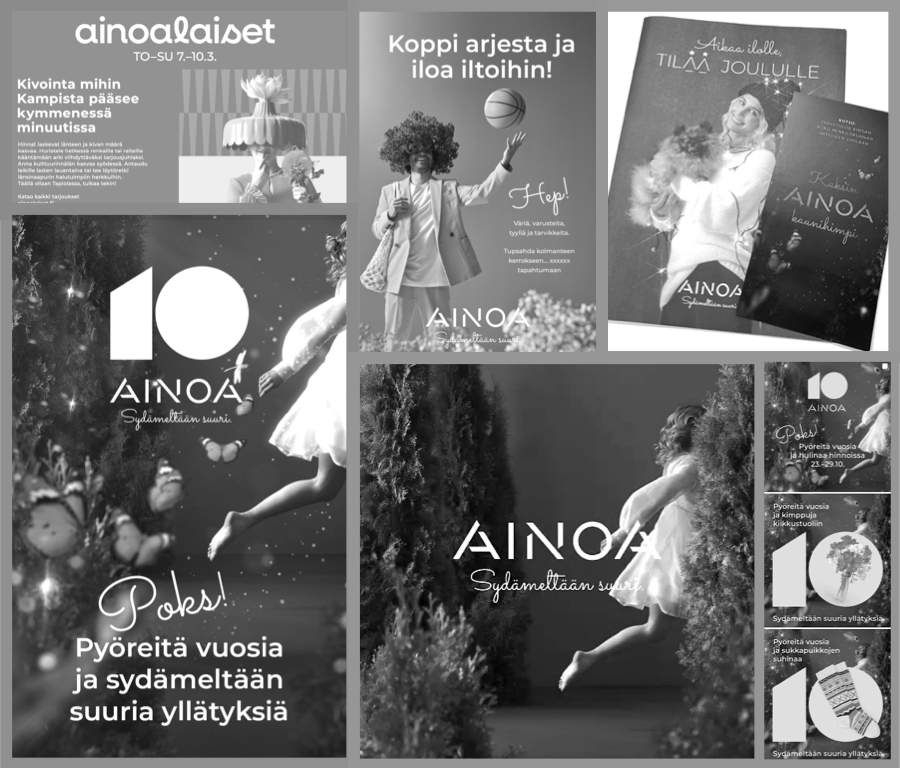 AINOA - sydämeltään suuri kauppakeskus. Löysimme helmen honkien helmoista. Kylän keskeltä Tapiolaa, Suomen suurimman kävelykeskustan ja kulttuuripalveluiden sydämestä. Puutarhakaupunkilaisten oman olohuoneen, jossa kahvitella rauhassa, piipahtaa uniikeissa kaupoissa, keksiä kulinaristin kielenkantaa kutkuttelevia ravintoloita. Ja hoitaa ihan arkisia askareita liikunnasta lottoon. Rakensimme yhdessä brändistrategiaa, kaivoimme esille kilpailuetua, annoimme lupauksia ja pidimme niitä, hieman haastoimme nenänpäät pakkasesta punaisina ja jihuu, valmista! Syntyi uusi luova konsepti, lupaus ja identiteetti. Ja kampanjoita kauppakeskukselle, joka ei halua kasvaa vain isoksi, vaan sydämeltään suureksi. Sillä tavalla suureksi, että MUMS! vaan piilottaa herkuttelun arjen sisään tai heittää kannat kattoon juhlaväen iloksi. Sellainen on AINOA, jonka 10 vuotta kestänyt tarina on vasta alussa.